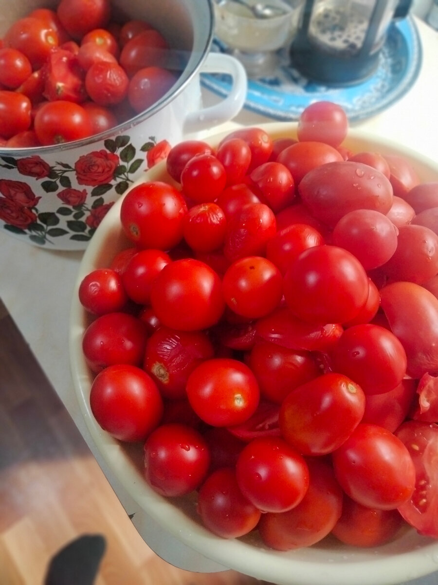 Здравствуйте! Я снова с заготовками, есть еще порох в пороховницах) Сегодня покажу, как делаю на зиму томатный сок. Впервые так сделала в прошлом году. Тогда помидор было столько, что никакой фантазии не было, что из них приготовить. И вдруг пришла идея сделать сок. Сначала сделала из своих томатов, и так он зашел, что мы не только свои все на сок пустили, еще и от бабушек лишние помидоры возили. В итоге в прошлом году сделала томатного сока около 25 банок объемом от 0,7 до 1,5 литров. И весь его благополучно выпили в течение года. В квартире храню в холодильнике, но долго он у нас не задерживается. Родители хранят в погребе. Это прекрасный способ утилизировать помидоры, когда уже нет сил над ними колдовать, крутить, солить, мариновать и так далее. У меня сегодня вот такое количество томатов. Я их не взвешивала, потому что изначально можно брать сколько угодно, сколько есть, и на сколько позволяет посуда, в которой сок будет вариться. Все помидоры я помыла и пропустила через мясорубку.