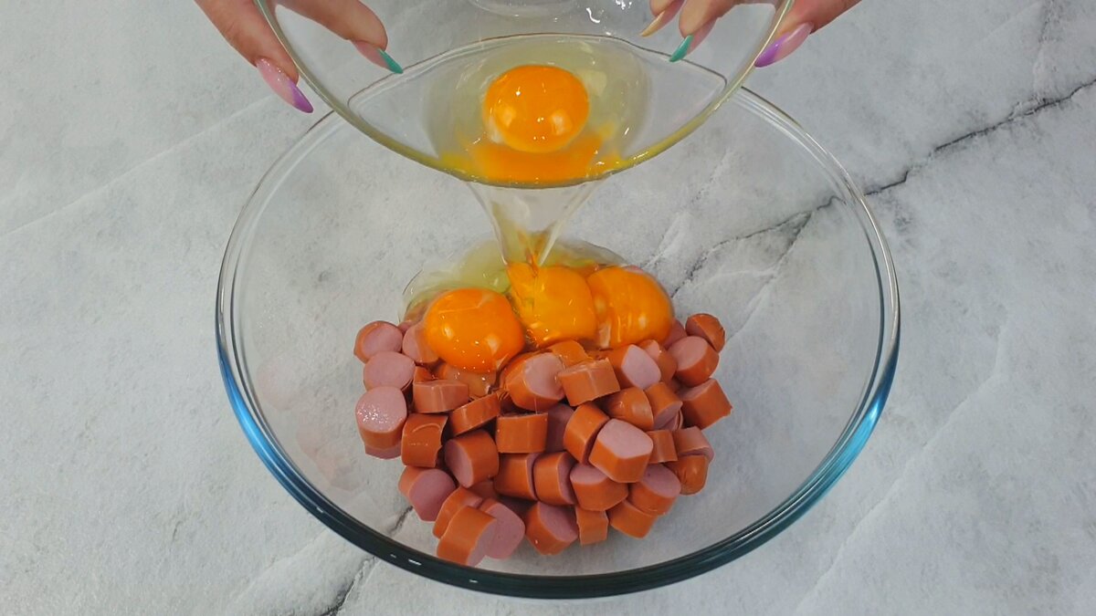 Смешиваю сосиски с яйцами, заливаю начинку в тесто и в духовку (если надоели обычные сосиски в тесте)
