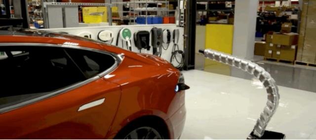 В 2015 году компания Tesla анонсировала робота для автоматической зарядки, основанного на змеевидной руке, имеющей около 20 суставов. Когда электромобиль приблизится к роботу, тот совершит стыковку с розеткой в открывшемся люке зарядного гнезда автомобиля и начнёт зарядку примерно через 30 секунд. Это супер резервный робот с низкой скоростью передвижения и небольшой нагрузкой на головку пистолета.