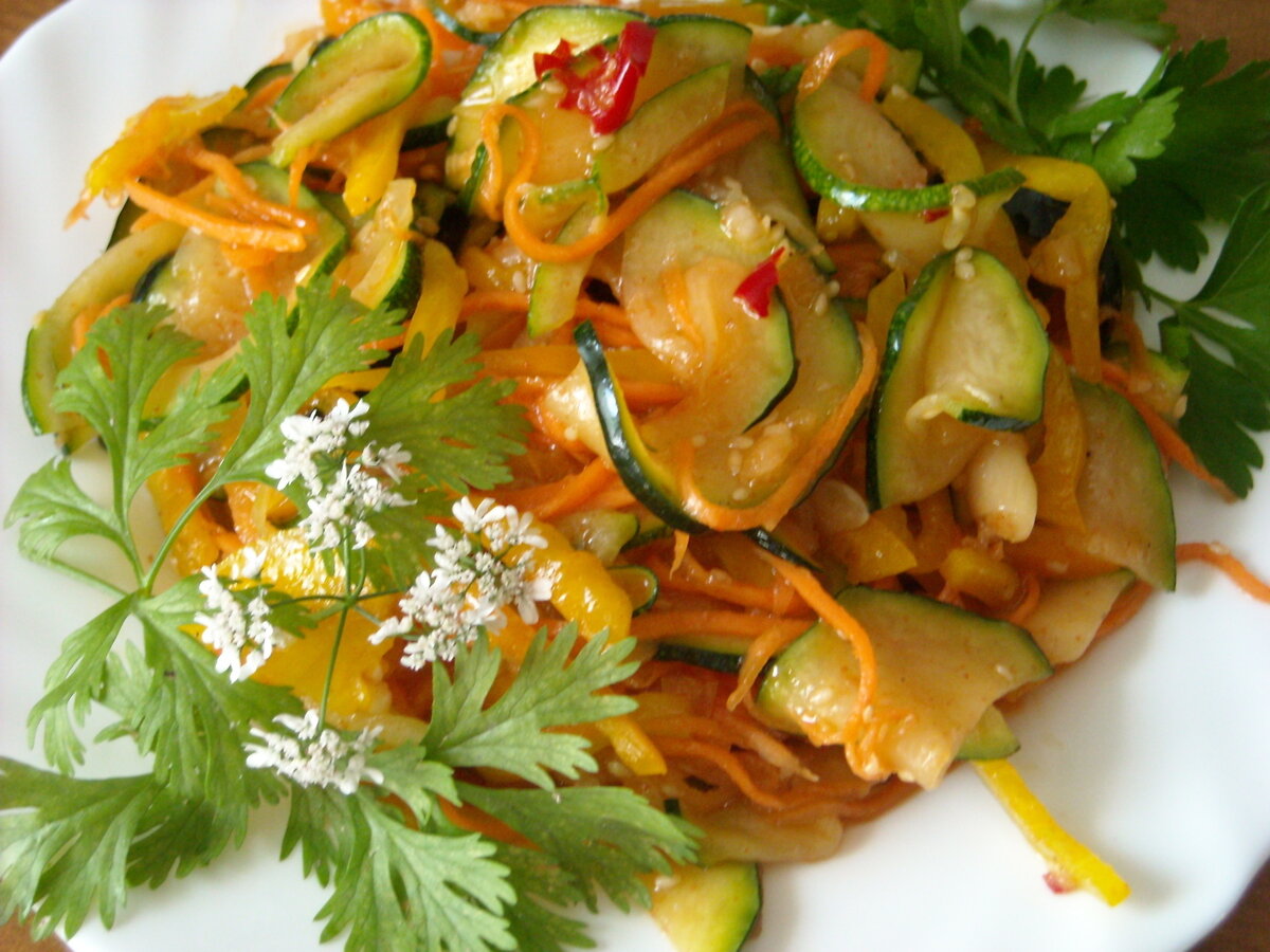Лук нарезать полукольцами, кабачки и морковь натереть на терке для салатов по-корейски. Болгарский и горький перец освободить от семян и нарезать соломкой, чеснок мелко порубить. Соединить овощи и остальные ингредиенты, оставить на 3 часа. Наполнить простерилизованные банки салатом, накрыть крышками, стерилизовать 20 минут. Банки закатать, перевернуть и укутать.