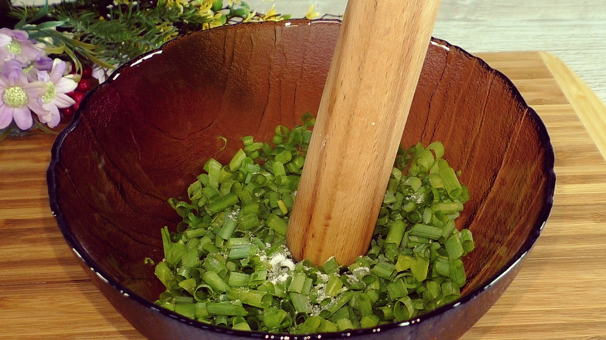 Лук нарезаем, добавляем щепотку соли и я его всегда немного приминаю.
