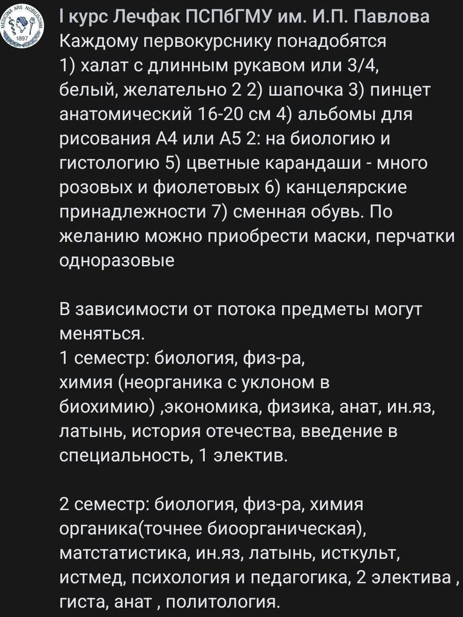 Один из самых распространенных вопросов, который стоит перед первокурсниками: "Что нужно купить для обучения?" На основании списка моего университета и советов многих старшекурсников я закупила большинство необходимых для меня вещей. Делая покупки я хотела максимально сэкономить, поэтому хочу с вами поделиться выгодными, на мой взгляд, предложениями. В конце первого курса я напишу, что пригодилось, а что оказалось лишним Список, который нам прислали: 1) Медицинский халат ( их необходимо покупать как миниму 2, желательно с длинными рукавами) Брала на размер больше, стирала при 30 градусах, чтобы не сели Я покупала в магазине Elit каждый за 2099 руб. 2) Медицинский колпак (покупала 2) Также нашла в данном магазине, он с фиксирующей резинкой сзади Каждый по 199 руб. 3) Обувь для практики Купила кроксы на Wildberries за 2319 руб. 4) Пинцет анатомический 200мм Купила на Wildberries за 304 руб. 5) Учебные пособия Этого не было ни в каких списках, я просто давно хотела приобрести по сове