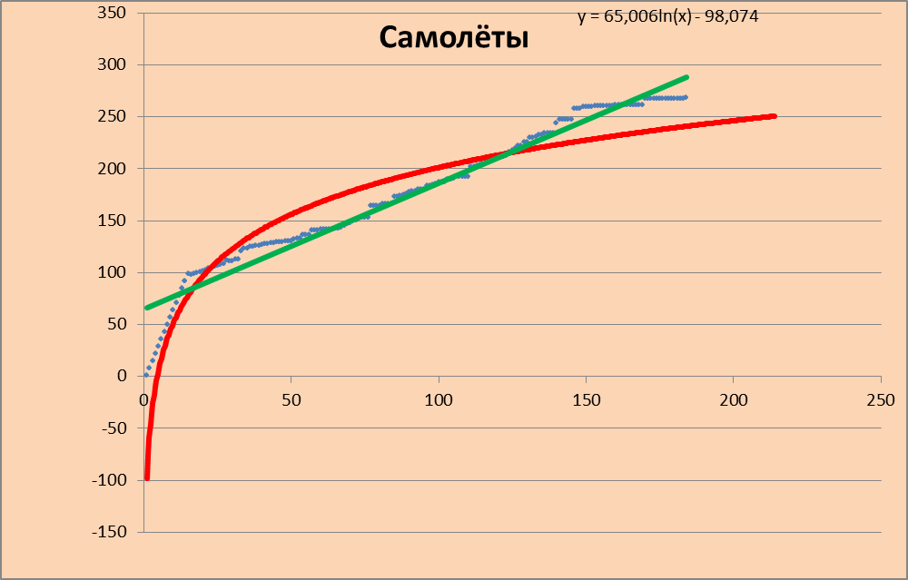 Продолжаем оценку состояния демилитаризации ВСУ по динамике уничтожения. Частота публикаций снижена, всё происходит в соответствии с прогнозами сделанными в мае. Текущее состояние констатирует анализ сделанный ранее. На графиках обозначены синими точками данные из сводок МО, зелёная линия аппроксимация по арифметической зависимости, красная по логарифмической зависимости. Приближения кривой составленной из синих точек по текущим данным к красной кривой означает, что уничтожать нечего, техники данного вида осталось минимальное количество. По прежнему существенных изменений в динамике по сравнению с предыдущим обзором не отмечено. Итак текущее состояние динамики. Динамика уничтожения самолётов ВСУ на 25.8.2022 г. На начало боевых действий было 152. ПРОИЗОШЛИ ИЗМЕНЕНИЯ. Кривая уничтожения самолётов оторвалась от зелёной линии и начала приближаться к красной. Собственные самолёты уничтожены, поставки продолжаются, но поставки уже не компенсируют убыль самолетов. Ориентировочно через