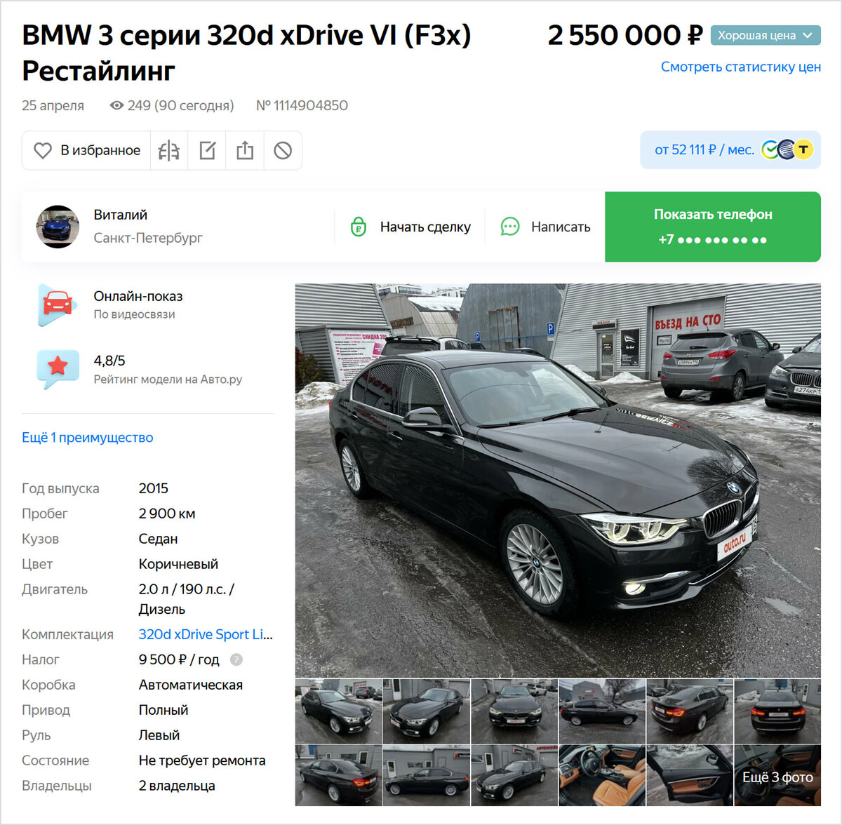 В Журнале мы часто рассказываем о так называемых «капсулах времени» — старых автомобилях, сохранившихся в отличном состоянии благодаря аномально маленьким пробегам. Вот, например, недавняя подборка таких машин, продающихся на Авто.ру. Но сначала мы стараемся проверить историю каждой из них. И по результатам проверки некоторые экземпляры можно переводить уже в другую категорию — героев рубрики «Не бит, не крашен». Вот как раз такой автомобиль — BMW 3 серии, выпущенный в 2015 году. Это одна из самых надёжных и практичных версий немецкого седана, с рестайлинговым 2‑литровым турбодизелем и полным приводом. Но главное, несмотря на возраст в 7 лет, его заявленный пробег всего 2900 км! На фотографиях этот BMW и правда выглядит новым. Дефектов на кузове не наблюдается, хром блестит, в салоне ни потёртостей, ни других следов эксплуатации. Комментарий продавца САЛОНЫ и ДИЛЛЕРЫ ПРОХОДИМ МИМО!!! Немецкая сборка,комплектация Luxury,по кузову вся в заводском окрасе,состояние нового автомобиля!Пробег