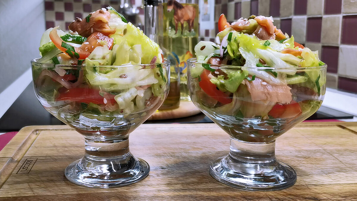 Вроде бы ничего необычного, все просто, а как хорошо идёт. Свежий салат с копченой рыбой, на ужин отличный варинт (рецепт с горбушей)