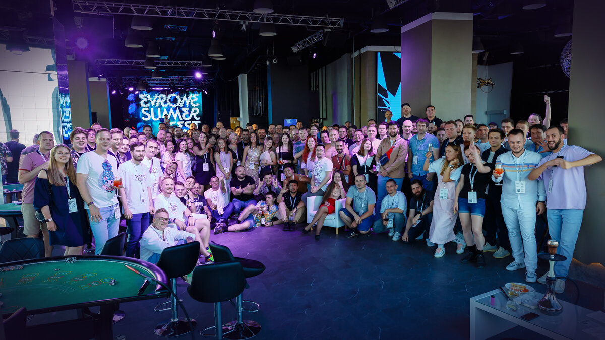 Для нас корпоратив не просто неформальное общение. Evrone — удалённая команда, которая собирается вместе всего раз в год. И для многих это единственный шанс увидеть реального человека, который прячется за буквами в мессенджере. В 2022 году мы второй раз провели корпоратив в формате Evrone Fest. Это значит, что вместо обычной вечеринки мы сделали полноформатное событие с множеством разных активностей. В этот раз мы забрались на самую высокую площадку Москвы — 90-й этаж башни «Федерация». Мы знакомились, общались, играли в покер и блек-джек, делали ставки в винном казино и разыгрывали в лотерею призы, главным из которых стал Apple iPhone 13 Pro Max 256 Гб. А ещё мы ели, пили, курили кальяны и смотрели салют. Полностью наши похождения описаны здесь. А пока лишь несколько цифр: Кстати, мы готовим и видео о фесте! А как прошёл первый фестиваль имени Evrone, можно не только почитать, но и посмотреть здесь.