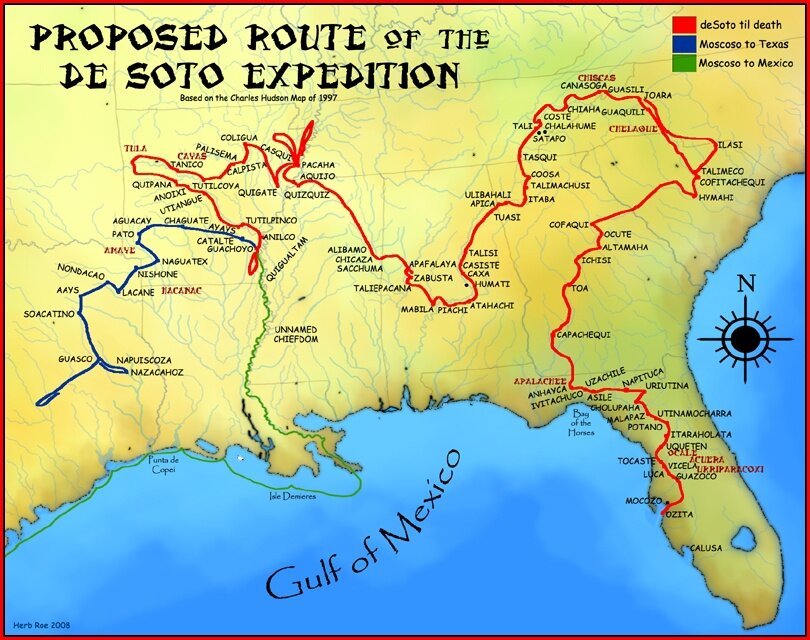 Но на деле, как мы знаем — лишь около половины участников вернётся обратно, причём только в 1543 году. И сам Эрнандо де Сото отправлялся тогда в свой последний поход. Как вышло, что столь многочисленная и столь подготовленная экспедиция обернулась в итоге несусветными тяготами и лишениями длиною в несколько лет — будем постепенно разбираться в следующих постах.