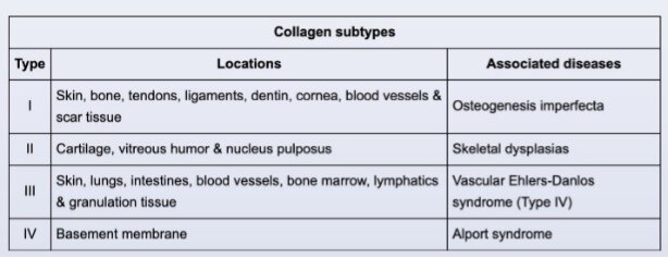 ligaments, skin). It is also the major organic component in bones and significantly contributes to overall bone strength. Defects in type I collagen can occur in osteogenesis imperfecta, an autosomal dominant disorder that may present with fragile bones and ligament laxity.