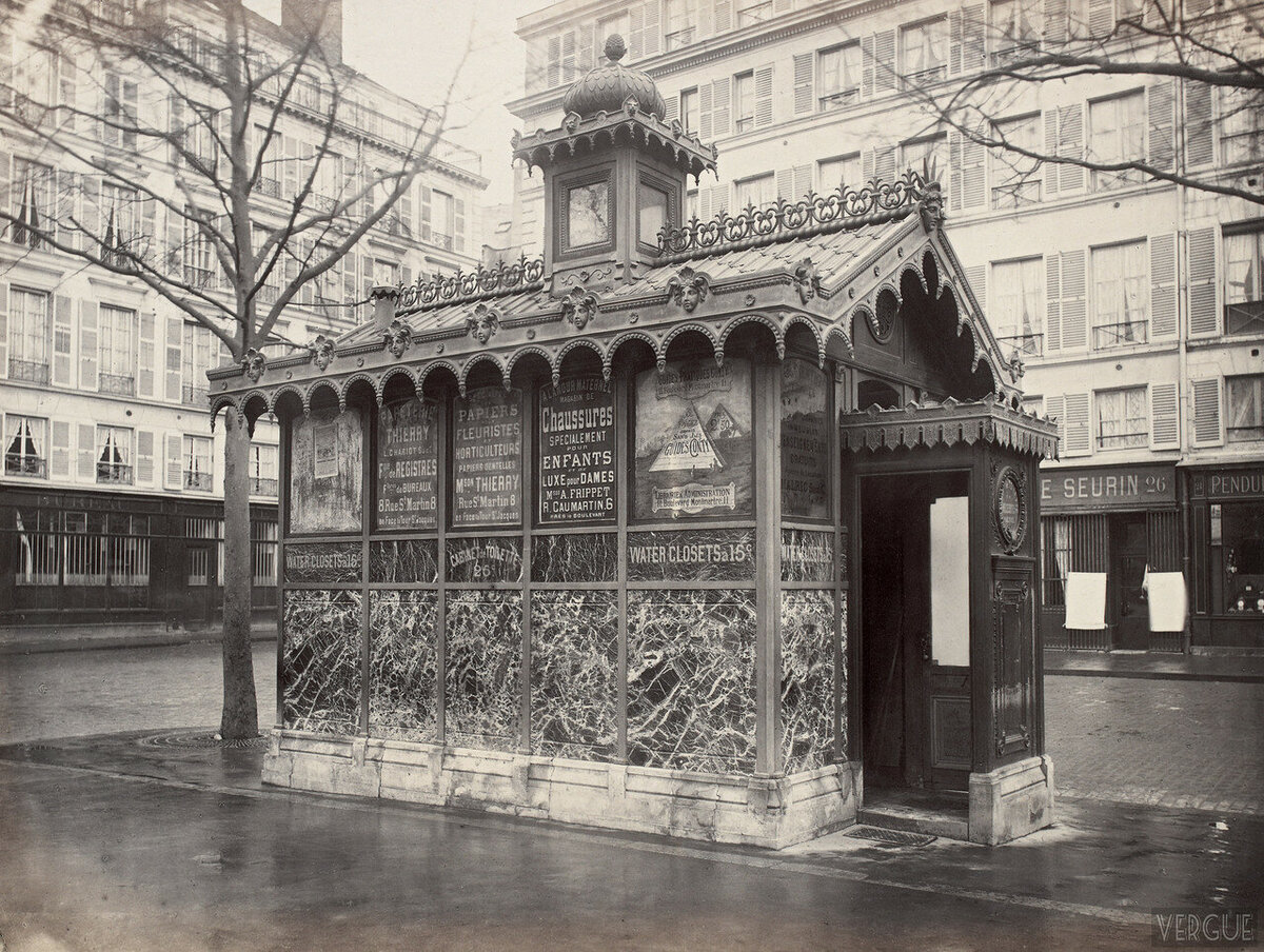 На заглавном кадре изображена уборная образца 1875 года в районе цветочного рынка Парижа. Прямо скажу, что в ней прекрасно всё. Ну а ниже сами понимаете что. Между прочим 1865 год, но бог с ним с годом. Занятно, что при желании внутри уборной можно рассмотреть рекламные плакаты. То есть уже тогда существовала реклама призванная двигать торговлю. На крыше и вовсе рекламируют парфюм. Довольно интересный подход.