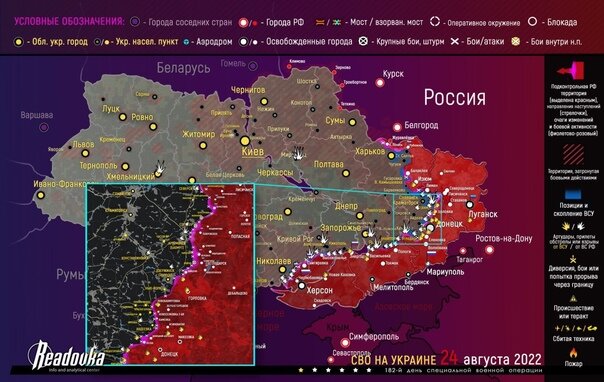 Ну что, продолжим следить за тем, что происходит на фронтах СВО. Сегодня поговорим про события трех дней, с понедельника 22 августа 2022 года по среду 24.08.2022 года. Вы может спросить меня, почему этот обзор занимает три дня, в то время, как предыдущий обзор был аж за целую неделю? Отвечаю - во-первых, и это самое главное, на фронте есть события, (это самое главное) и события достаточно интересные, во-вторых, 24 августа прошло ровно погода с начала СВО, какая-никакая, а круглая дата, и в-третьих, 24 августа Руина празднует день недонезавсисимости. Надо тоже отметить. Но все по порядку.