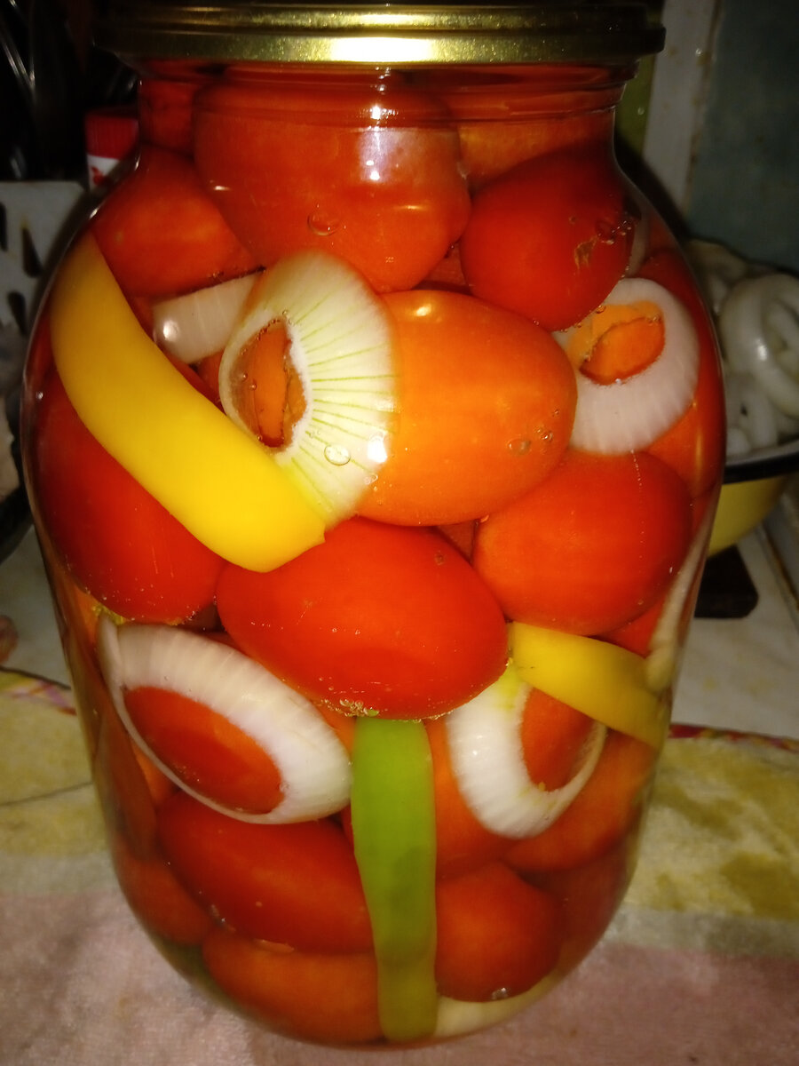 Вчера закрывала помидоры на зиму. Стоит жара, поэтому они мелкие, но зреют быстро. Я срываю их зелёными и храню в тёмном месте. Сегодня перевезли помидоры с огорода домой. Надеюсь, что ещё вырастут, пока с этими разбираться буду. Поливаю каждый день, может и доживут до похолодания и дождя. Помидоры созрели как- то одновременно, красивых навыбирала почти два вёдра и решила их закрыть. Перемыла помидоры, банки двухлитровые приготовила. Думала уложиться в шесть штук, но в итоге вышло восемь банок. Почистила и нарезала перец. Меня на днях угостили разноцветным перцем. Жёлтый, даже скорее оранжевый, мне понравился, собрала с него семена. Перца уходит 1-2 штуки на банку. Почистила и нарезала лук кольцами. В среднем на банку нужна 1 средняя луковица. Специи и консерванты, которые я использую. Закипятила воду и банки. В горячую банку на дно положила перец чёрный и душистый, и гвоздику. Затем на дно положила немного лука и болгарского перца. Наполнила банки помидорами. Примерно в с