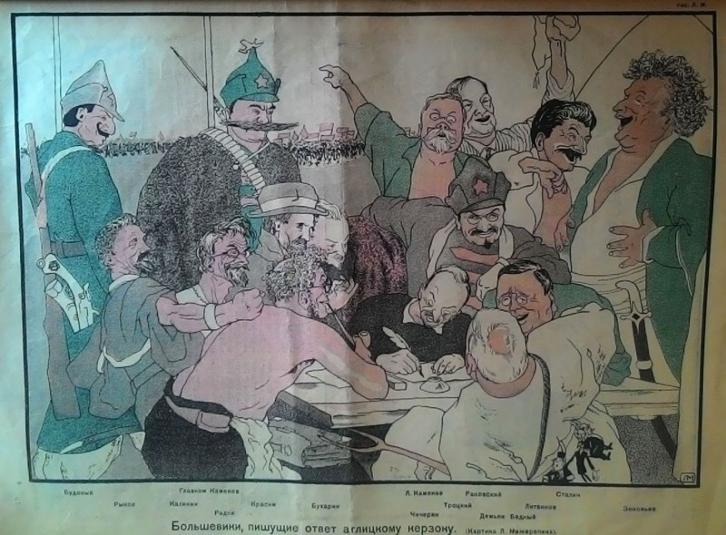 Рисунок Л.М. Журнал «Красный перец», 1923. «Большевики, пишущие ответ аглицкому керзону».