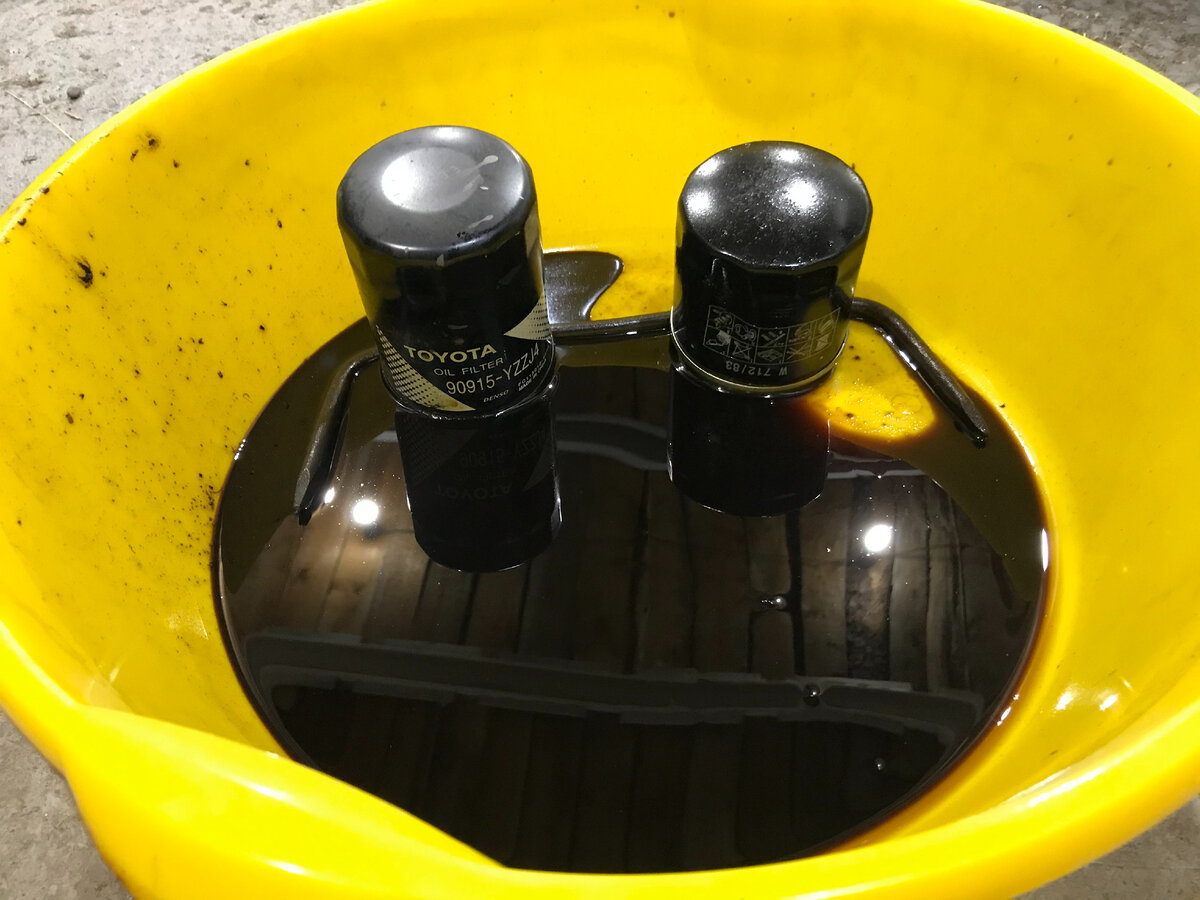 Оба фильтра были сняты с автомобиля сразу же после остановки двигателя и пролежали какое-то время отверстиями вверх чтобы масло с них не вытекало. Для начала я перевернул оба фильтра и оставил их на сутки чтобы масло по максимуму из них вытекло. Все масло, которое Вы видите на верхнем фото, вытекло из фильтра TOYOTA 90915-YZZJ4. Из фильтра MAN W712/83 оно конечно тоже немного вытекло, но этого масла совсем не много, буквально 3-5 миллилитров, а может и того меньше.