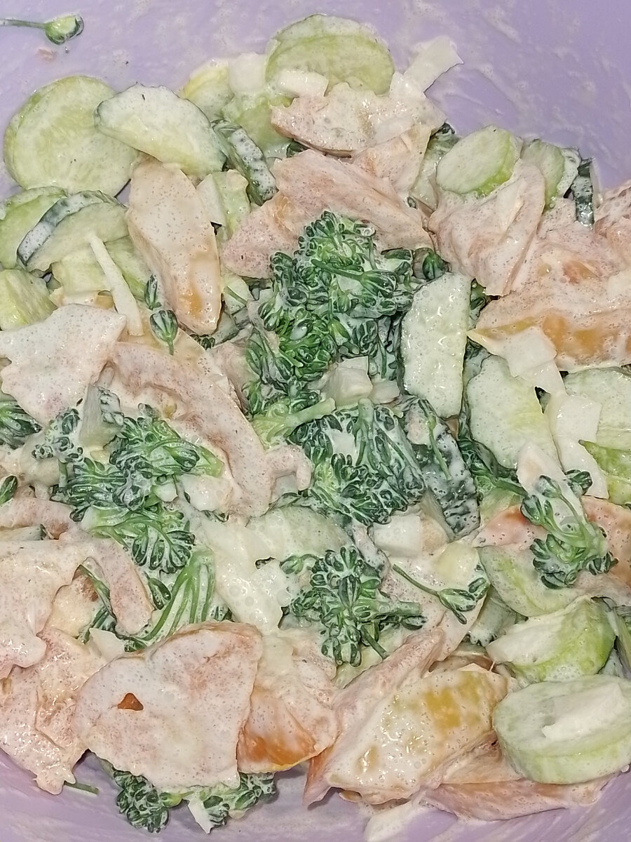Простой салат из сезонных овощей, с брокколи особенно вкусный. Берем овощи, у меня это лук, огурцы, помидоры и брокколи. Брокколи делим на соцветия, заливаем на пару минут кипятком, воду сливаем. Остальные овощи нарезаем в салат привычным способом. Я режу на средние кусочки, по размеру они получаются примерно как соцветия брокколи. Заправлять такой салат можно любой заправкой. У меня сегодня сметана, соль и перец. Все перемешиваем и можно подавать к столу.