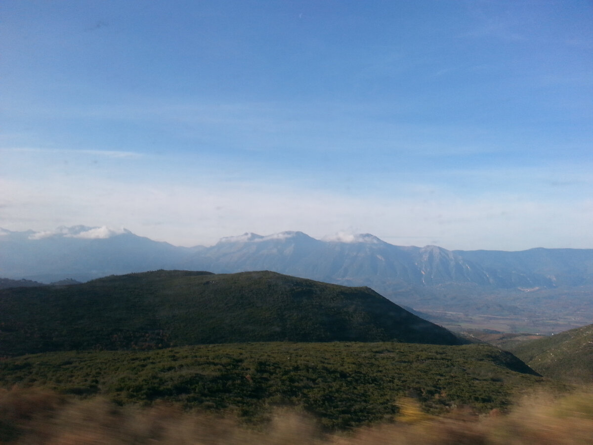 От тумана избавились только поднявшись на плато, отделяющее долину Аркадии от долины реки Эвротас. Через некоторое время открылись замечательные виды Тайгетских гор и долины знаменитого Эврота.