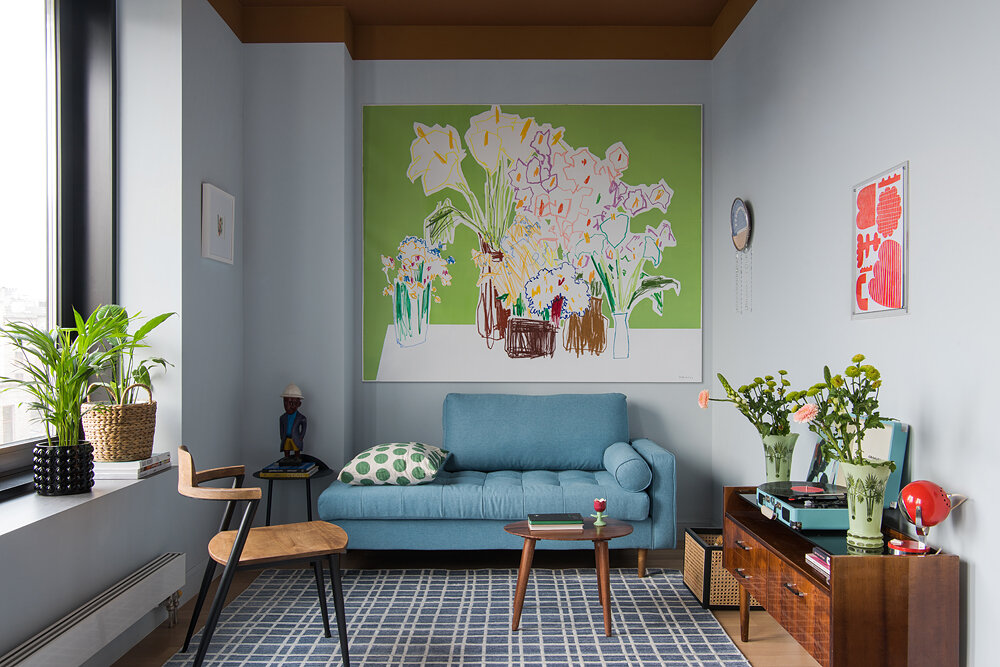 Эта квартира площадью 42 кв. метра — уже второй совместный проект дизайнера Евгении Полещук и Дарьи Сабельниковой, основательницы выставочного пространства для начинающих художников betweenwindows и арт-менеджера. «Когда Даша решила перебраться поближе к центру и купила эти апартаменты, она снова обратилась ко мне. — рассказывает дизайнер. — В творческом плане у меня была почти абсолютная свобода». «Исходное помещение — довольно узкое, удлиненное, с двумя окнами по одной стене и свободной планировкой. В квартире я выделила гардеробную и санузел, остальные помещения — это студия, разделенная на зоны. Большой стол идеально подходит для шумной компании друзей. Спальню отделили от гостиной стеной и шторой». Концепция интерьера вдохновлена цветовой гаммой фильмов Уэса Андерсона «Отель „Гранд Будапешт“» и «Семейка Тененбаум». «Вначале появилось сочетание бледно-голубых стен и терракотового потолка, — вспоминает Евгения. — Потом Даша призналась, что мечтает о геометричной росписи в спальне, и