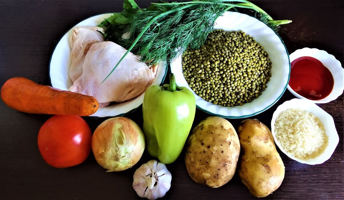 Сегодня я приготовлю суп из маша. Для меня это любимый суп из моего детства. Я его немного переделала (нарезку овощей) под себя (каждая хозяюшка на своей кухне адаптирует блюда под свой вкус), но при этом вкус супа не испортился, даже наоборот. Приступим Для приготовления мне нужно: Начала приготовление с того, что замочила в холодной воде маш, предварительно промыв его. В воде он должен полежать минимум час. Лук нарезала не очень мелко. Перец болгарский нарезала. Морковь натерла. Зелень и чеснок мелко нарезала. Картошку почистила и нарезала не крупными кубиками. В казане разогрела 250 мл растительного масла. Закинула лук. Прожарила и сверху положила курицу. Обжарила. Затем добавила морковь и болгарский перец. Все перемешала. Курицу убрала в одну сторону (она готовится быстро и может развалиться при перемешивании), а овощи жарила до золотистой корочки (чем поджаристее будут овощи, тем красивее и вкуснее будет ваш суп). Теперь курицу вынула из казана. Очистила и нарезала на порционные
