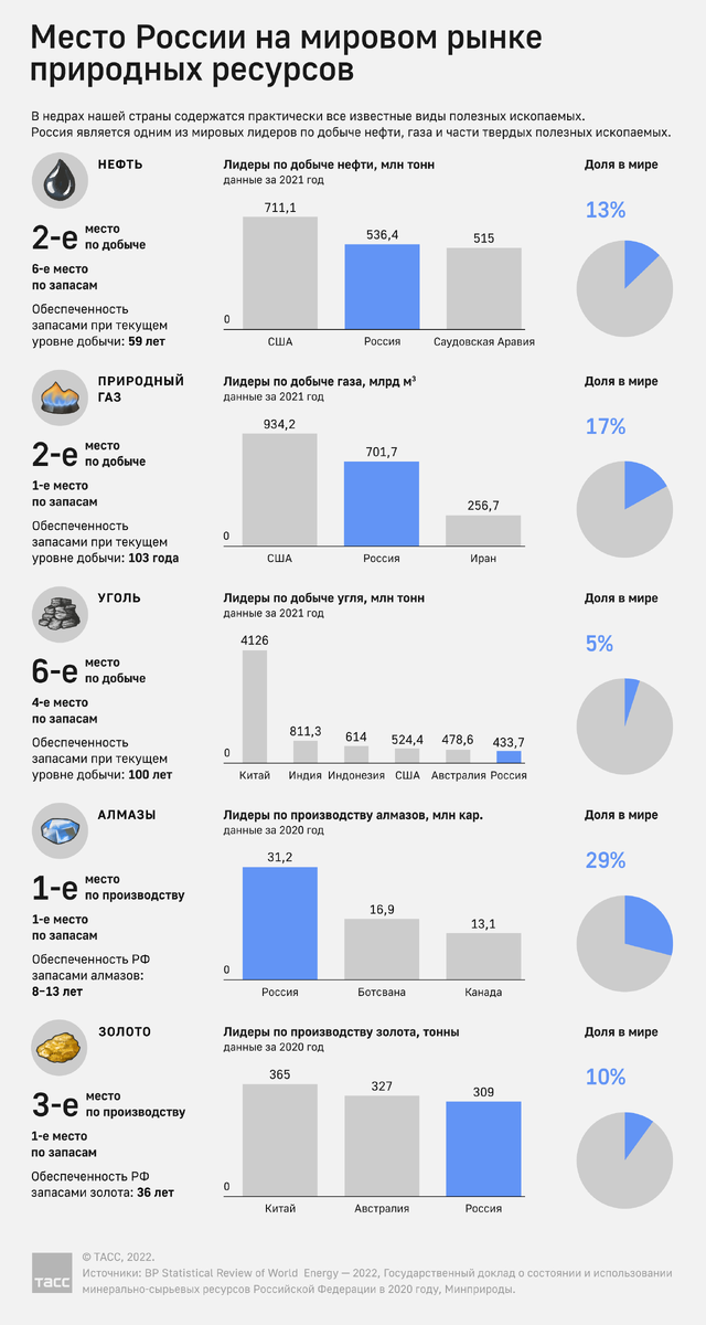 Россия — одна из самых богатых природными ресурсами стран. В недрах нашей страны содержатся практически все известные виды полезных ископаемых. Россия лидирует по запасам алмазов и золота — ископаемых, которые не теряют своей ценности на протяжении многих столетий. Россия занимает первую позицию среди стран — производителей алмазов и замыкает тройку лидеров по производству золота. Также Россия занимает второе место по добыче нефти и природного газа. Подробнее о природных ресурсах России — в инфографике ТАСС.