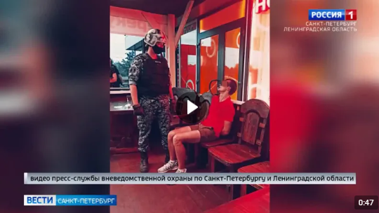 Сюжет программы "Вести Санкт-Петербург" (телеканал "Россия 1") о том, что в городе Петергофе сотрудники межрайонного отдела вневедомственной охраны по Петродворцовому району задержали гражданина, который размахивал ножом на Разводной улице и ранил лезвием 13-летнюю девочку. Ссылка на сюжет: https://vk.com/rosgvard78?w=wall-143037784_8402