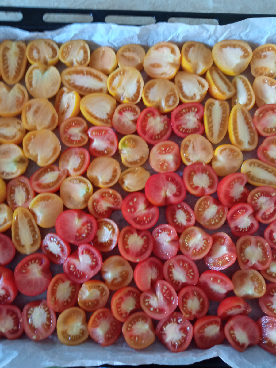Решила приготовить вяленые помидоры. . Помыла, разрезала на половину (они у меня маленькие). Семечки не доставала. . На противень постелили пергамент и разложила помидоры. Присыпала солью, сахаром, хмели сунели (можно взять любую приправу по вашему вкусу). . Поставила в духовку (у меня газовая) на минимальный огонь 🔥 и чуточку приоткрыла дверцу. Томила около 6 часов. Смотрите по готовности. Примерно на 3-ем часу вяления на каждую дольку помидора я положила ломник тонкий чеснока. . Банки и крыши помыла, обдала кипятком и разложила помидоры в тёплые банки. . Залила рафинированным подсолнечным масло и немного добавила оливкового. Закрутила крышки и поставила в холодильник. Кушать можно по разному. Добавлять в салат, к бутерброду, а также при приготовлении пиццы. #вяленыепомидоры #вяленыетоматы #уютотольги #хуснулинаольга