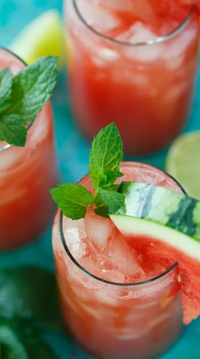 2. Смешать арбузный сок, лимонный сок, газировку, подавать со льдом и ломтиком арбуза