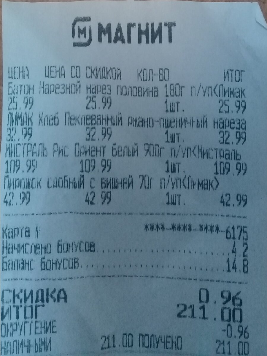 Всем здравствуйте! Пишу с опозданием, так как все успеть невозможно - и работа, и дом, и магазины... В четверг у меня осталось всего лишь 255 рублей и я совершенно не планировала тратить деньги, если только на хлеб... Но... чудесным образом у меня оказались "бесплатные" помидоры, с которыми срочно нужно было что-то делать. Ну я и пустилась во все "тяжкие"... в растраты. Дома не было крышек для консервирования (закончились), ну и соответственно пришлось "оставить" 300 рублей в магазине за упаковку крышек. Крышки беру только фирмы "Светлана". Планировала готовить 2 закуски из помидоров: лечо и закуску с рисом. Соответственно, мне нужно было купить перец, рис и чеснок... Однако количество купленного почему-то увеличилось в разы, когда я обошла магазины. Первым на пути следования был магазин "Магнит". Сумма покупок - 211 рублей. Купила: 1) половинку батона 180 грамм нарезного за 25,99 рубля 2) половинку хлеба нарезанного за 32,99 рубля 3) пирожок с вишней сыну за 42,99 рубля Это запланиров