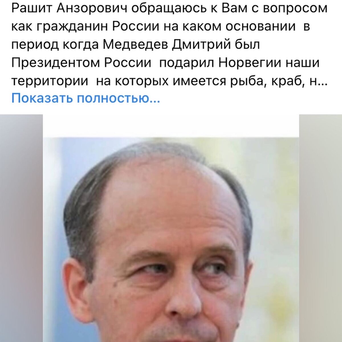Уважаемый Александр Васильевич, я Шидаков Рашит Анзорович обращаюсь к Вам с вопросом как гражданин России на каком основании в период когда Медведев Дмитрий был Президентом России подарил Норвегии наши территории на которых имеется рыба, краб, нефть, уголь? На каком основании земли и воды подарены Норвегии? Разве данное действие не является предательством родины? Ведь кроме того что мы потеряли территорию, так теперь там ООН там установила там свои ракеты, что считаю очень опасным для жителей России в сложившееся время. Несмотря на то что, Медведев уже давно не президент, он занимает сейчас должность заместителя председателя Совета Безопасности Российской Федерации. Прошу провести проверку на каком основании находясь в должности Президента России Медведев подарил наши территории Норвегии, тем самым в столь не простое время как сейчас в России подверг опасности граждан России, ведь там установлены теперь ракеты. И как народное достояние России как нефть и земли России переданы- подарены