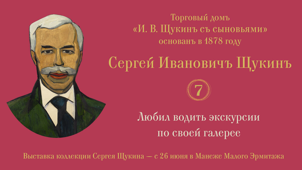 Мы продолжаем еженедельную рубрику, посвященную талантливому коллекционеру и меценату Сергею Ивановичу Щукину. Новая визитка — новый факт! В предыдущей визитке мы рассказывали, что Сергей Иванович Щукин с детства заикался, но стойко боролся с этим недугом. Поэтому еще более удивительным кажется тот факт, что коллекционер не боялся публичных выступлений, а напротив, любил водить экскурсии по своей галерее. Изначально щукинский особняк в Большом Знаменском переулке открывал свои двери для посетителей только по воскресеньям, достаточно было записаться по телефону. Чтобы гостям было легче ориентироваться в залах и произведениях, они получали каталог. «Он собирал для самого себя, в лучшем случае для множества русских художников, для которых он каждое воскресенье открывал двери своего гостеприимного дома», – писал немецкий искусствовед Отто Гаутофф. Насладиться собранием приходили многие деятели искусства рубежа веков: Илья Репин, Василий Кандинский, Михаил Ларионов, Наталья Гончарова, Алекс