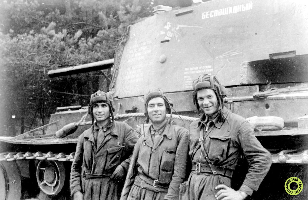 © Евгений Евтушенко. Откуда взялся танк? Появился танк в самый разгар войны - в 1942 году. "Отцами" для боевой машины стали известные художники КУКРЫНИКСЫ и не менее известный поэт С.Я. Маршак. В апреле 42 им были вручены Сталинские премии, которые они решили направить на покупку тяжелого танка КВ-1. А уже к концу мая танк был готов к бою. Он вошел в состав 23-ей отдельной гвардейской танковой Ельнинской Краснознаменной бригады. Почему «Беспощадный»? Хоть и кажется, что танку сложно затеряться, но когда вокруг такие же зеленые собратья, дело принимает другие обороты. Именно по этой причине танк персонализируют. Громкое имя «Беспощадный», разрисованная башня танка (где советский танк разносит в клочья Гитлера) и с
