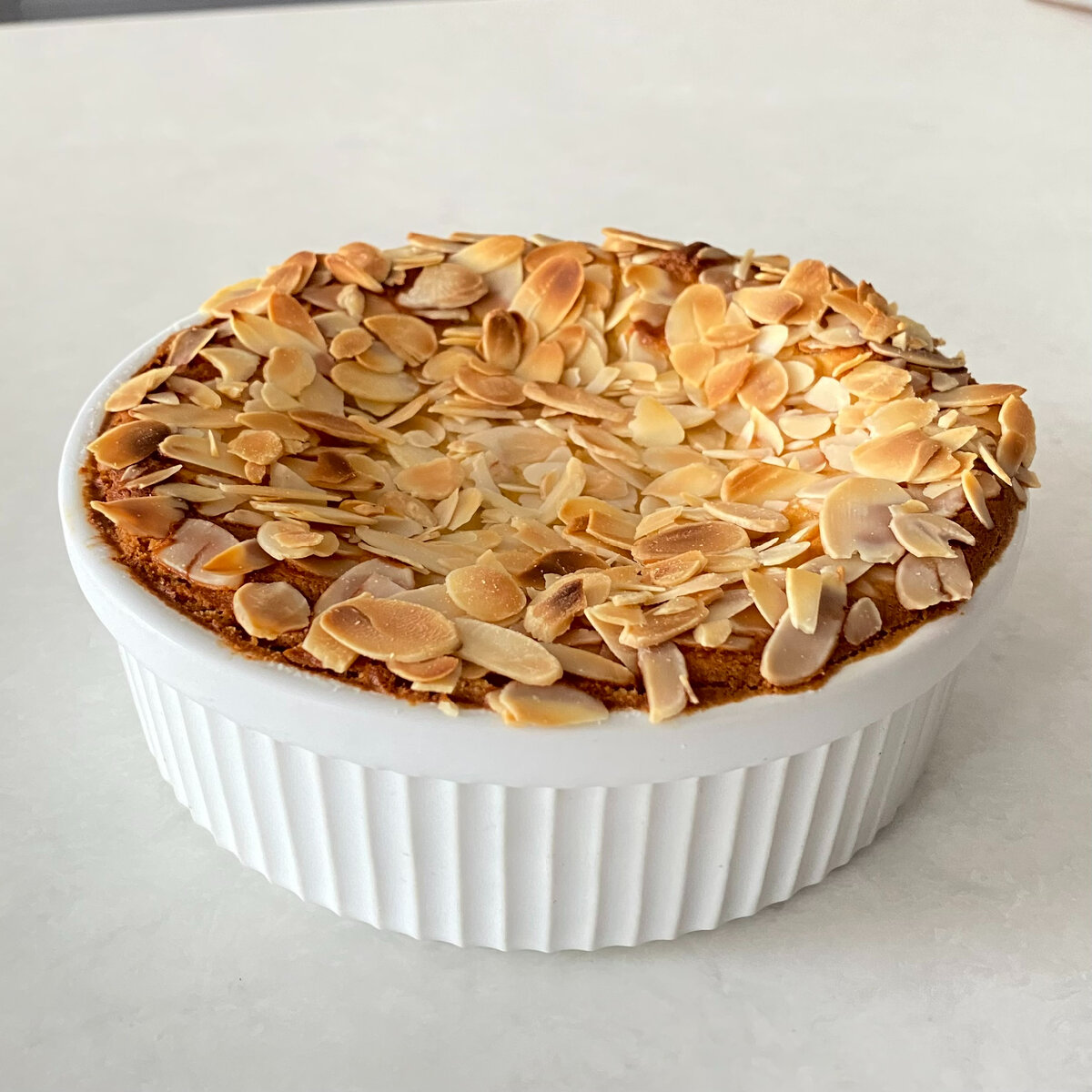- Посыпьте пирог миндальными лепестками и отправьте в духовку выпекаться примерно на 30-40 мин. Пирог должен слегка подняться в центре.