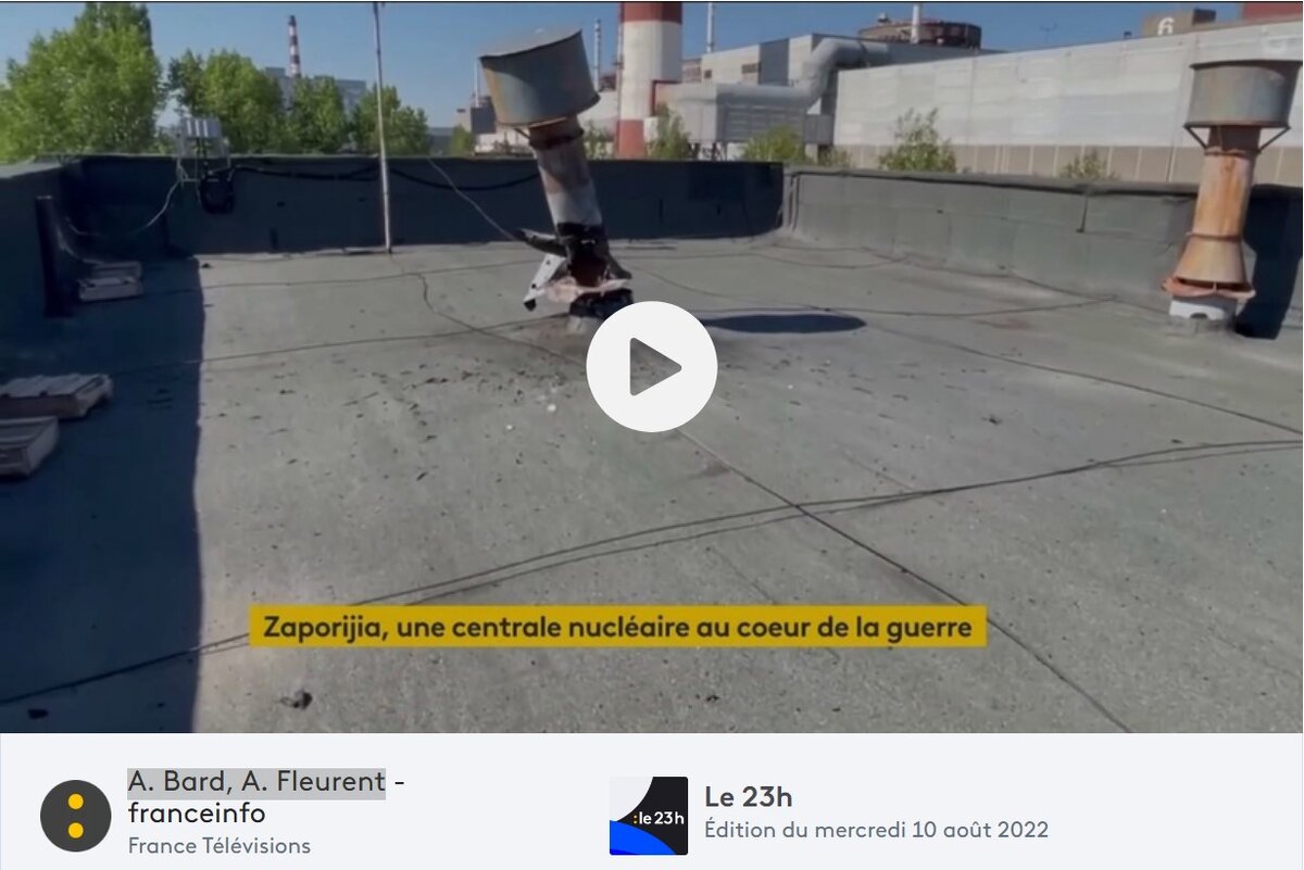 В середине августа в вечерней новостной программе телеканала France Info был показан двухминутный телерепортаж из района Запорожской АЭС, снятый французскими журналистами А.Бард и А.Флеран. Кадры этого репортажа впоследствии прошли по всем центральным СМИ не только Франции, но и мира. Я лично видела их в новостном сюжете на японском телеканале NHK. Репортаж начинается крупным планом некой крыши с титром: «Запорожье, атомная станция в сердце конфликта». Закадровый женский голос взволнованно сообщает: «В среду, 10 августа, этот снаряд, воткнувшийся в крышу, но не разорвавшийся, упал всего в нескольких метрах от ядерного реактора». От таких новостей неискушенный французский обыватель, наверняка, пришел в ужас и не смог спать ночью. Но есть, к счастью, и более опытные зрители. Один из них оставил на сайте France Info следующий комментарий: «Неплохо бы проверить факты, указанные в репортаже. На первом кадре видно, что это не снаряд, воткнувшийся в крышу, а чем-то поврежденная вентиляцио