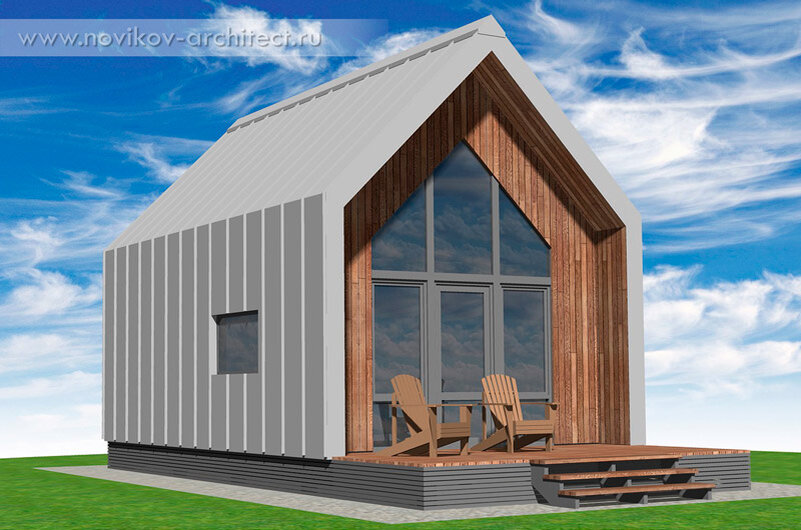 Дом в современном стиле: скандинавский, барнхаус. Он может быть домом для дачного участка, гостевым домом, или для сдачи в аренду. Кроме того его легко переделать в баню (переоборудовав сан.узел под парилку, а вместо прихожей сделав моечную).