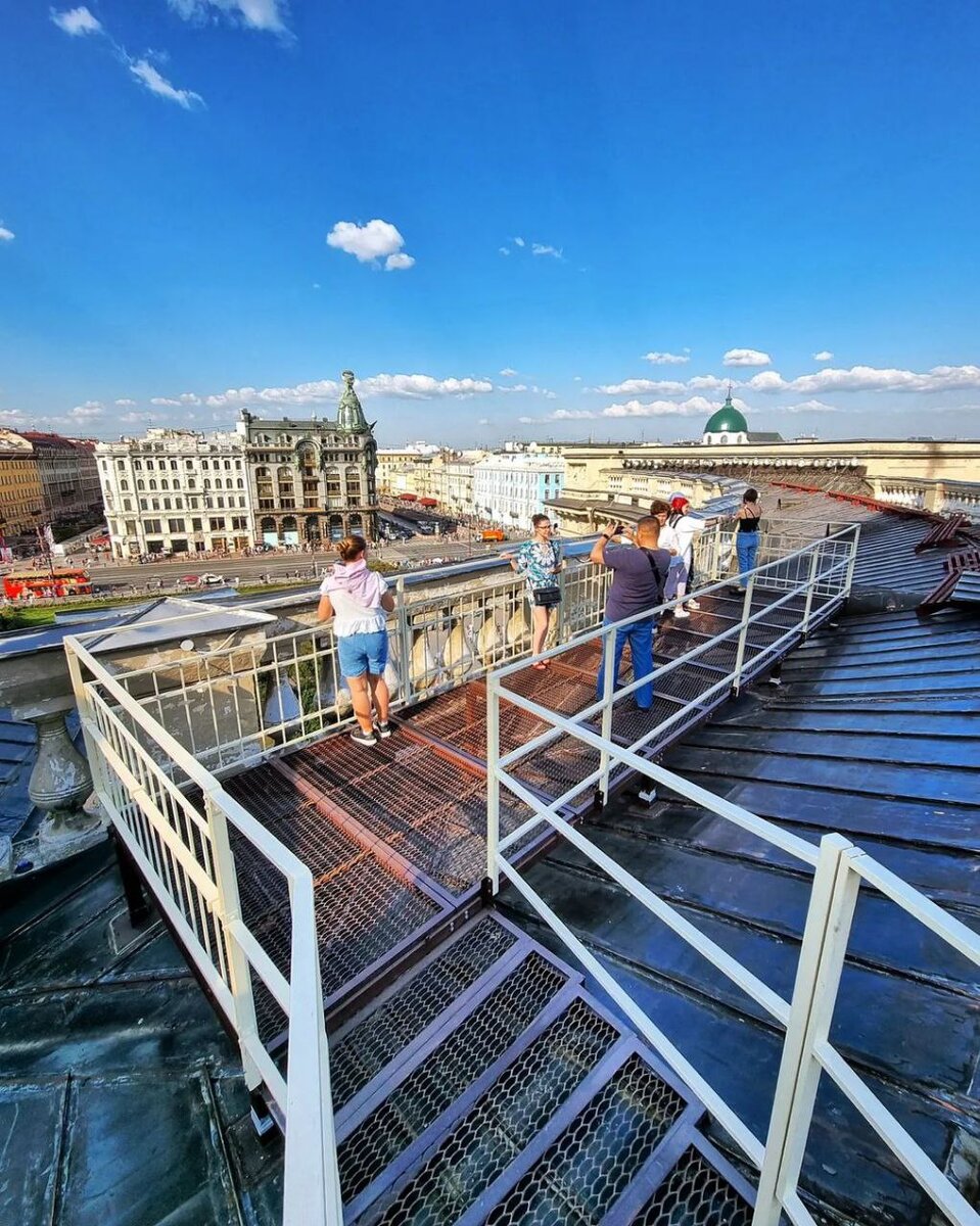 Вслед за Владимирской колокольней обзорная площадка появилась этим летом и на втором по значимости храме города - Казанском соборе. Я сходил опробовать и делюсь впечатлениями с вами. Несмотря на масштаб самого собора, площадка для обзора получилась одной из самых маленьких в Петербурге. Основной вид с неё открывается по сути только в одну сторону - на Невский проспект и Казанский сквер. Тем не менее, вид, конечно, очень красивый. Доминантой выступает массивный Дом Зингер со знаменитым стеклянным куполом, как на ладони открывается весь зелёный садик с фонтаном, видны также памятник Барклаю-де-Толли, канал Грибоедова и Казанский мост, дом Гансена, купол базилики св. Екатерины, Думская башня и здание ассигнационного банка. Можно вблизи рассмотреть и сам купол Казанского собора, а также некоторые барельефы на его верхних ярусах и детали колоннады. Подъём на площадку возможен ежедневно примерно с 12 до 17 часов. Поднимают пока что исключительно группами, которые набираются каждые полчаса-