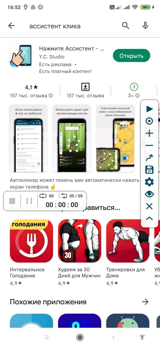 Скачиваем Ассистент Клика на гуглплей Чтобы залить необходимые макросы, скачиваем их в любую папку, лучше создать специальную и запускаем прогу. Жмём на дискету в верхнем правом углу Дальше жмём на стрелочку. Прога может выёживаться и предлагать оформить подписку, просто выходим назад и снова жмём стрелочку. Но, если уже загружено три макроса,надо какой-то удалить. Ищём папку куда скачали и выбираем нужный макрос Всё, макрос загружен. В бесплатной версии можно загрузить одновременно три макроса. Как использовать кликер. Запускаем прогу и жмём запустить сервис. Если появляется такое меню,жмём отмена и снова запустить сервис. Если не запускается, проходим в настройки и даём необходимые разрешения Сервис запущен, жмём на дискету Выбираем необходимый макрос, нажав на иконку плей Открывается макрос, заходим в игру и сверяем расстановку кнопок. Если не совпадают из-за разного разрешения экрана ,раставляем вручную как на скриншоте к макросу. Просто зажимаем кнопку и переносим на нужное место