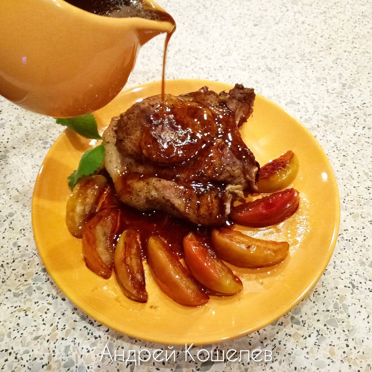 7. Специи - соль, перец черный, сухой чеснок, розмарин, паприка подкопченная, измельченный мускатный орех, корица молотая (специи по вкусу, но не много. Способ приготовления: 1. Промываем мясо под холодной водой, просушиваем (можно бумажным полотенцем), хорошенько натираем смешанными специями и выкладываем на разогретую сковороду. 2. Обжариваем с одной стороны минут восемь, переворачиваем на другую и закрываем крышкой. Держим еще минут 8-10. 3. Теперь приступаем к яблокам. Моем, разрезаем на восемь частей каждое. Выкладываем на раскаленную сковороду со сливочным маслом и добавляем совсем чуть-чуть растительного. 4. Обжариваем с одной стороны минуты четыре, далее переворачиваем на другую и заливаем медом. Карамелизируем еще минуты три. Убираем со сковороды только яблоки. 5. На ско