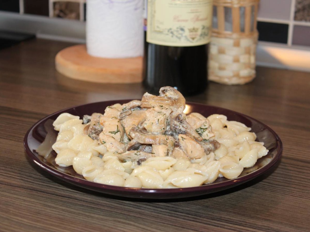 Вкусно и просто! Даже и добавить нечего! Ингредиенты Приготовление: 1. Репчатый лук чистим и режим полукольцами, и выкладываем глубокую сковороду с разогретым растительным маслом. Обжариваем лук, до тех пор пока он не приобретет легкий золотистый цвет. 2. Куриную грудку нарезаем на небольшие кусочки и добавляем в сковороду к луку. Обжариваем на протяжении 5-7 минут, периодически помешивая. 3. Нарезаем свежие шампиньоны. Для этого блюда можно использовать любые грибы, кроме того они могут быть замороженными, а не свежими. 4. Добавляем шампиньоны в сковородку и обжариваем на сильном огне всё вместе еще минут 5-7. 5. Убавляем огонь, добавляем 3-4 ст.л. сметаны, накрываем крышкой и тушим на медленном огне минут 20-25. 6. За 5 минут до готовности добавляем мелко порезанную зелень укропа, снова закрываем крышку и продолжаем тушить. По истечению времени подаём с любым гарниром, но больше всего мне нравится с макаронами. Получается нечто похожее на итальянскую пасту. Приятного аппетита! Ккал: