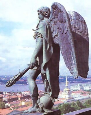 Хотите увидеть настоящего Орка, а не придуманного западными писателями. Вот он перед вами стоит в Петербурге в «римской» военной амуниции в накинутом длинном плаще (признак знатности) на самой высокой точке собора с ПЛАМЕННЫМ МЕЧОМ-ХрисаОРОМ в руке и поднятым вверх коротким мечом (скифским). Пламенный Меч у него опущен и значит- древняя война закончена. Шлем тоже снят и лежит рядом у ноги. На груди небольшой «крестик». Это покровитель Севера России Архангел Уриил (см. «Ящик Пандоры. Архангел Уриил и город Архангельск»). Великий Оружейник и Воин, Вождь народов. И это реальная историческая личность- победитель в Войне Богов. Он обладал неким непобедимым оружием Ором, вместо лезвия у которого было пламя-ор. Оно от богов. От Ора произошло слово «оружие» (версия автора).