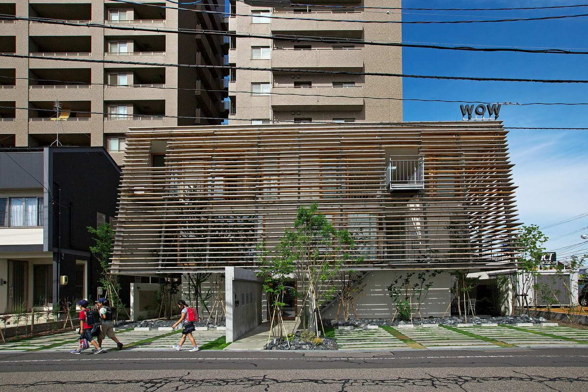 Очередной архитектурный фокус японских архитекторов. По своему назначению это здание, построенное в пригородном районе с разноплановой застройкой, многофункционально, по масштабу и планировочным решениям вполне может быть и жилым домом. В доме три этажа — внизу находится ресторан, на втором этаже — офис, на третьем — многоцелевое сдаваемое в аренду помещение, которое включает в себя кухню и ванную комнату. С тыльной стороны вдоль бетонного забора устроен небольшой вытянутый сад, а с другой стороны, начиная со второго этажа, ещё один. От уличного шума внутренние помещения защищены деревянным экраном, он же защищает и от визуального вмешательства. Название: Проект Wow! Sta.