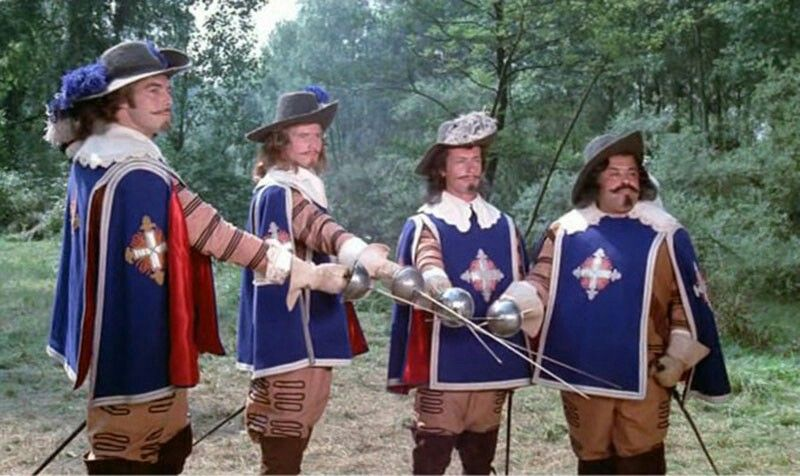 1. Четыре мушкетёра / Les quatre Charlots mousquetaires. Франция, 1974. Режиссер Андре Юнебелль. Сценарист Жан Ален (по отдаленным мотивам романа Александра Дюма «Три мушкетера»). Актеры: Жерар Ринальди, Жерар Филипелли, Жан Саррю, Жан-Ги Фешнер, Джозефина Чаплин, Даниэль Чекальди, Бернар Аллер, Карин Петерсен, Жак Сейле, Жан Вальмон, Катрин Журдан и др. Прокат в СССР – 1978: 56,6 млн. зрителей за первый год демонстрации. Прокат во Франции: 2,2 млн. зрителей.