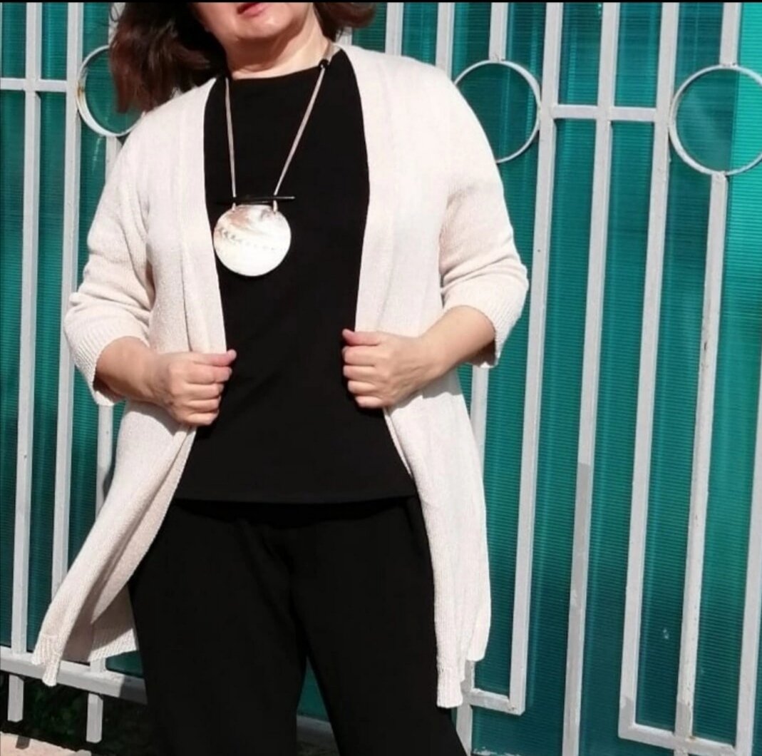 Знаете друзья, у меня есть большая любовь - это натуральный шёлк. Обожаю его за нежные прикосновения к коже и красоту его благородного блеска. За его качества сохранять температуру тела в теплое время и в прохладное. Поэтому, когда я решила связать летний кардиган, то мой выбор, в первую очередь, пал именно на натуральный шёлк. Для проекта я выбрала шёлк сплетенный из тонкой нити в цепочку, что очень украсило поверхность полотна, сделав блеск шёлка немного зернистым. Получилось очень необычно. Красивый оттенок белого - крем-брюле оказался не только нарядным, но и достаточно универсальным. В целом кардиган получился очень комфортным и удобным.Отлично вписался в гардероб, хорошо гармонирует с разной одеждой и аксессуарами. Благодарю, что прочитали пост. Буду рада вашим комментариям. Подписывайтесь на мой канал.
