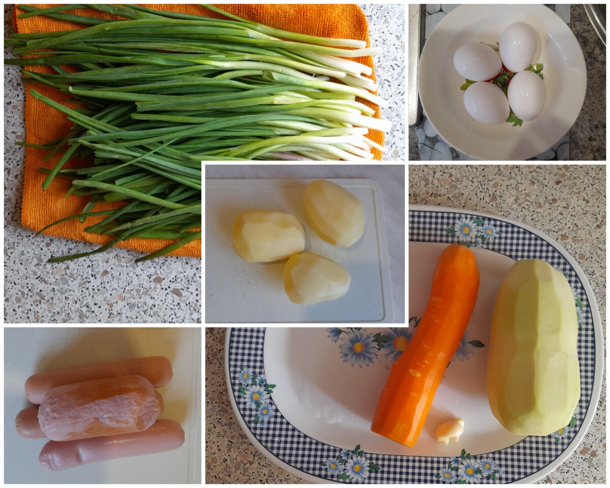 Вот оно вкусное и полезное. Кабачки. Детки любят, можно и маленьким. Нам понадобится: Картофель натереть на крупной терке, залить водой. Оставить с водой, пока подготавливаете остальные ингредиенты. Так уйдёт немного крахмала и картофель не почернеет. Морковь очистить и натереть на мелкой терке. Кабачок очистить, если совсем маленький, без семян, то можно вместе с серединкой натереть на мелкой терке, отжать 2-3 раза, чтобы слить сок . Если оставить так, то запеканка станет жидкая, водянистая, как не пропеченная. Нарезать квадратиками сосиски, лук, укроп. Взять большое блюдо, поместить все туда. Добавить морковь, кабачок, картофель, вбить яйца. Все перемешать, посолить, поперчить по вкусу. Добавить муки. Муки можно и больше, если видите, что содержимое получается сильно жидким, но желательно не переборщить с количеством муки, а то запеканка получится суховата и вкусом ближе к омлету. В смазанную форму выложить кабачковый фарш, поставить в разогретую духовку на 45-50 минут, на 19