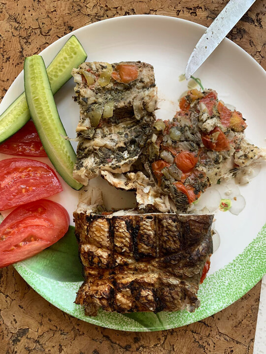 Рыба, фаршированная овощами, запечённая на углях или в духовке