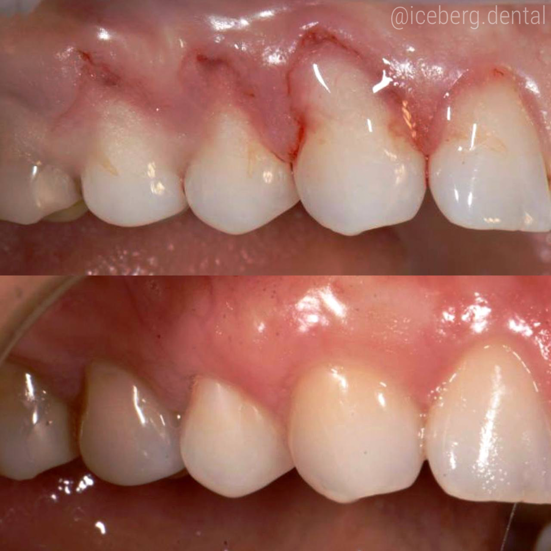 Оголился корень зуба, десна опустилась, что делать?» Рецессия десны - ситуация при которой оголяется шейка зуба и поверхность корня зуба. Наиболее частые причины рецессии десны - агрессивная чистка зубов щеткой и абразивными пастами, - ортодонтическое лечение, - пародонтит, - перегрузка зубов. Поверхность корня стирается в 10 раз быстрее (80 микрон в год), чем эмаль (6 микрон в год) - и через некоторое время на обнаженной поверхности появлятеся углубление, так называемый клиновидный дефект. Основные жалобы при этом: ✔повышенная чувствительность зубов и боль от горячего/холодного/сладкого/кислого. В «черном списке» оказывается все больше и больше продуктов ✔неприятные ощущения или боль при касании, что иногда делает чистку зубов невозможной и еще больше усугубляет чувствительноть и может привести к кариесу корня ✔нарушение эстетики улыбки - зуб выглядит слишком длинным Часто открытые шейки предлагают реставрировать. Однако многие знают на своем опыте, что эти пломбы час