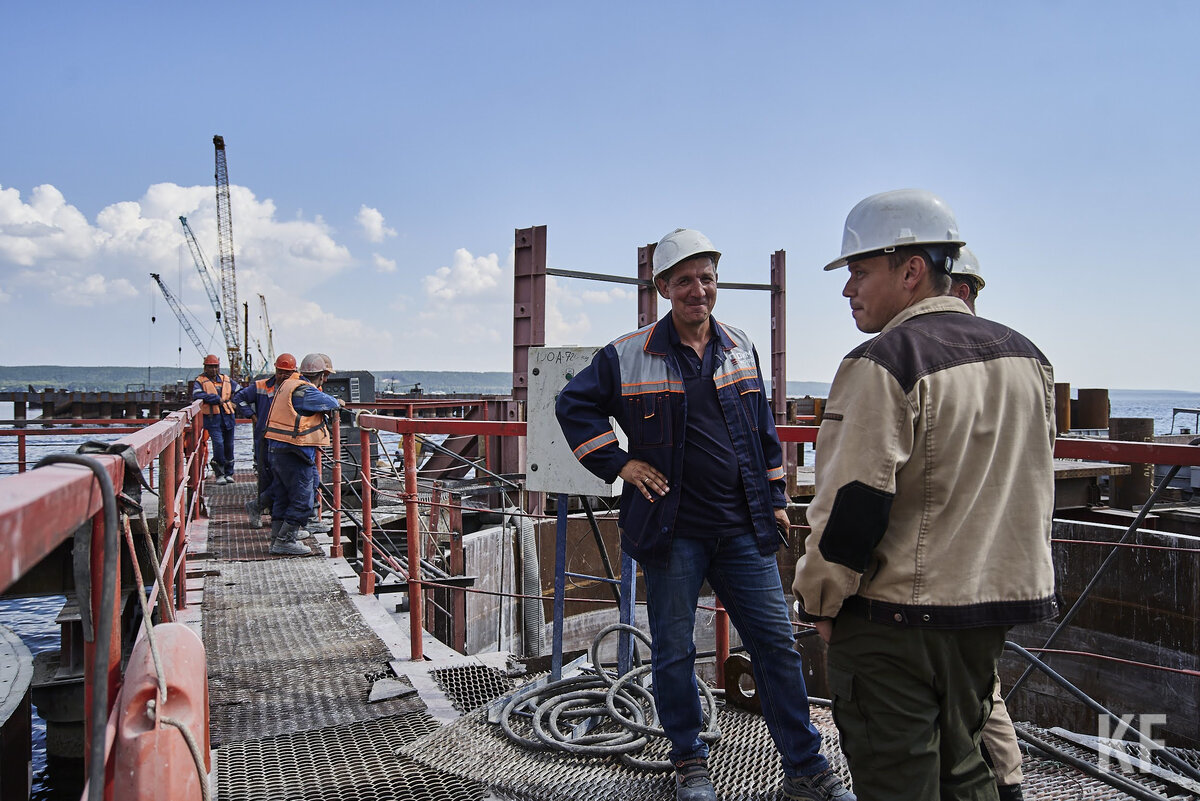 – У нас есть определенные трудности с доставкой. Правый берег Волги довольно высокий, он не позволяет опускать туда бетон и какой-то транспорт. Поэтому мы используем метод перекачки: с помощью двух бетононасосов мы перекачиваем бетон в бетоносмесители и уже по наведенному наплавному мосту, состоящему из барж, доставляем к месту производства работ, – объяснял Крымский.