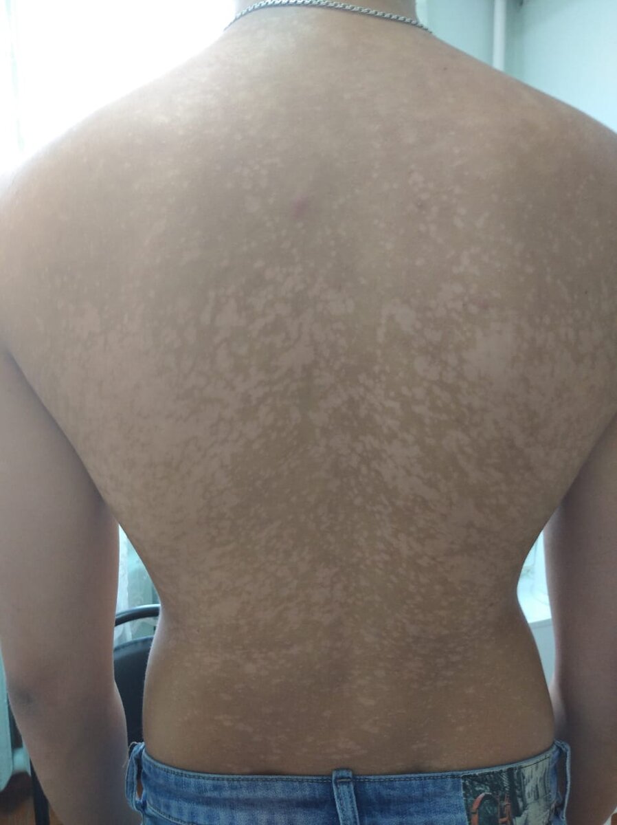 Причина заболевания в изменении защитных свойств кожи, изменение кислотности кожи (рН), что может быть связано с внутренними заболеваниями (анемия, сахарный диабет, паразитарные инвазии, инфекции, дисбактериоз, гастрит и другие) Предрасполагающим фактором служит повышенное потоотделение, контакт кожи с тренажерами в спортивных залах, ношение чужой одежды и частое мытье кожи. Риск контагиозности в этих случаях повышается. Грибок поражает поверхностный слой кожи: проявляется в виде пятен различных оттенков, которые увеличиваются в размерах и сливаются между собой. На поверхности пятен едва заметное шелушение. На фоне загара пятна выглядят более светлыми, так как через разрыхленный слой кожа получает недостаточную дозу инсоляции для загара. Диагностика: 1. Проба Бальзера (йодная). Пораженную кожу смазывают йодом и быстро протирают спиртом, таместь отрубевидный лишай пятна резко выделяются, окрашиваясь в темно коричневый цвет. 2. Соскоб с кожи на патогенные грибы. Обнаружат под микроскопо