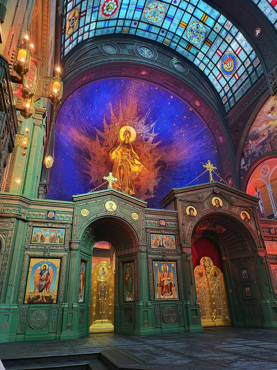 Заходя в Храм Вооруженных сил, внимание сразу останавливается на образе Христа Воскресшего на фоне ночного неба. В одной руке Господа свиток, а другой Он благословляет людей. Тени и в жизни ложаться так, что сложно рассмотреть лицо Спасителя. Образ очень интересный, похожего ранее нигде не встречала. Напоминаю, что сам храм посвящён Воскресению Христову. Поднимаясь выше, удалось взглянуть на внутреннее устройство алтарной части, что девушкам удаётся не так часто😁.