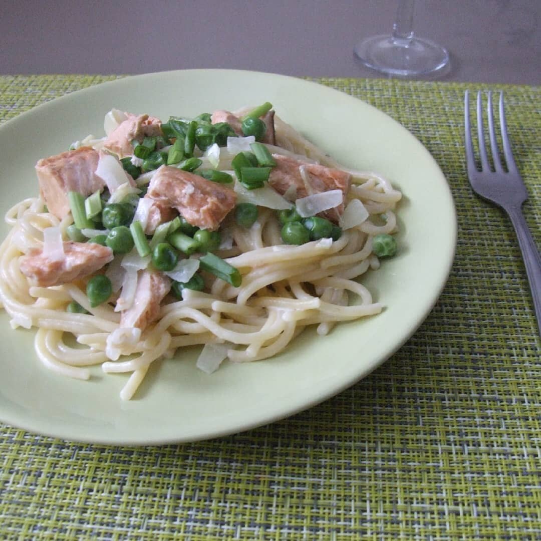 Отварить пасту согласно инструкции на упаковке, слейте воду и оставьте пару ложек отвара. Горошек отдельно отварить в течение 3 мин, затем откинуть на дуршлаг. Приготовить лосось на пару. Разогреть масло, обжарить лук на слабом огне до золотистого цвета. Добавить чеснок и пожарить 1 мин. Положить сливки, лосось, горошек и перемешать. Готовить 1 мин., затем добавить воду из-под макарон. Смешайте пасту с рыбой, посолите, поперчите, украсьте зеленью и подавайте на стол пока не остыла. Приятного вам аппетита.🤗
