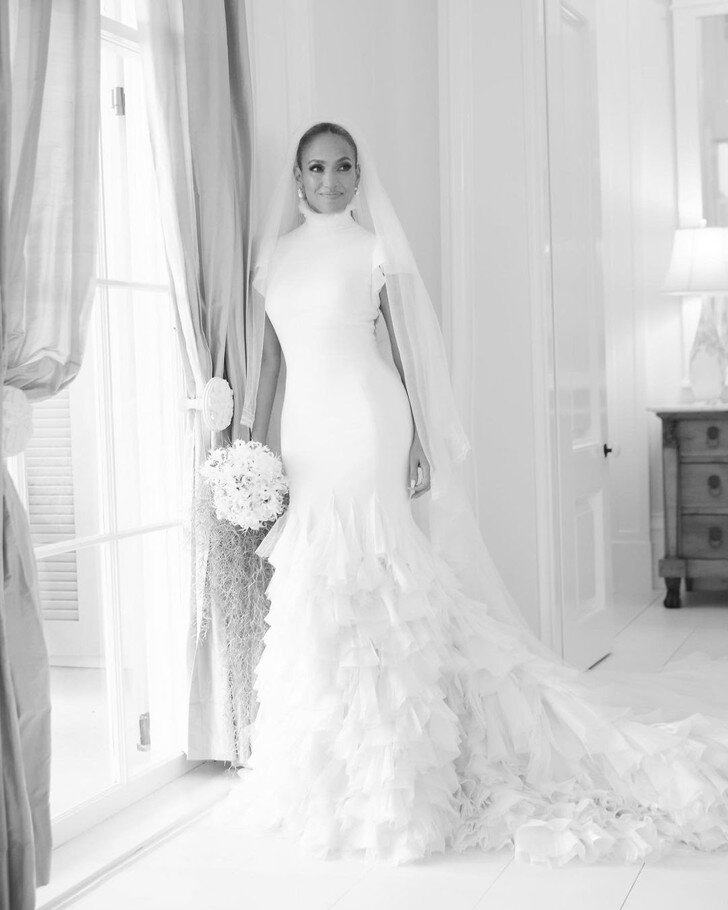 Романтический ход со свадьбой в Вегасе имел грандиозные последствия в виде церемонии для близких друзей в поместье Аффлека в 35 гектаров. К столь долгожданной церемонии Джен подготовилась основательно отшив на заказ не 1 супер-платье а целых три. В данной статье мы подробно рассмотрим все три образа невесты. Все образы созданы модным Домом Ralph Lauren! Начало торжества Лопес осветила выходом к алтарю в нежном образе с хрупким силуэтом. Платье-русалка - облегающий силуэт платья футляр + расклешенная от колен юбка, напоминающая хвост. Короткие летящие (читай "порхающие на встречу любви" и, в данном случае, алтарю) рукава крылышки (да, те самые которые мы так любим в наших моделях). Воротник стойка с перьями. Потребовалось более 500 метров ткани, чтобы создать воздушную юбку из множества лоскутков. Затем мастерицы Дома вручную прикрепили ее к платью. Слишком закрытое для лета, подумали вы? Но нет, вырез по спинке однозначно сделал платье непригодным для холодов. Фата была классической дл