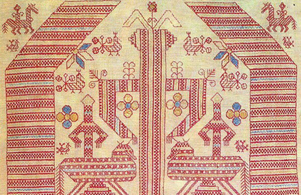 Основной традиционной схемой древней ритуальной вышивки была, как известно, трехчастная композиция: женская фигура (богиня? жрица?) в центре и два всадника по сторонам её. Древние мотивы в вышивке, сохраненные лучше всего на Севере, были распространены очень широко. И. Я. Богуславская подчеркивает «общерусский характер древних мотивов народной вышивки», перечисляя те губернии России, где они изучены: Архангельская, Вологодская, Олонецкая, Новгородская, Псковская, Петербургская, Тверская, Ярославская, Смоленская, Калужская, Тульская, Орловская, Воронежская, Тамбовская.