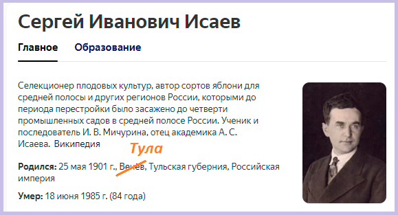 В прошлой публикации по Сергея Ивановича Исаева (1901-1985, профессор, доктор наук, знаменитый селекционер плодовых культур) мы исправили неточность в месте его рождения. Ранее считалось, что он родился в городе Венёве. После долгих поисков запись о рождении Сергея Ивановича нашлась в Туле. Но история его венёвских предков очень интересна, и в ней тоже имеются "белые пятна", с которыми мы сегодня постараемся разобраться. Дед Сергея Ивановича - Сергей Исаевич Исаев - был из государственных крестьян деревни Козловки Михайловского уезда Рязанской губернии. Козловка (Козловская слобода или Козловские Выселки) была основана переселенцами из села Печерники. По этому в некоторых документах Сергей Исаевич записан как "крестьянин села Печерников", а в некоторых как "крестьянин Козловской слободы". Его сын Иван Сергеевич Исаев за безупречную 20-летнюю службу в должности делопроизводителя в городе Михайлове получил звание потомственного почётного гражданина. Все дети Ивана Сергеевича родились в Т